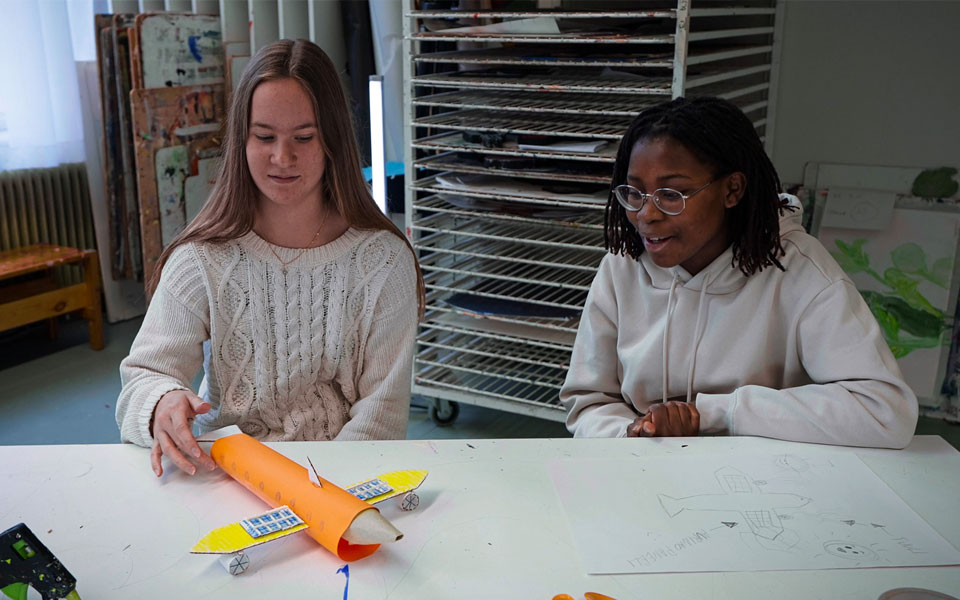 Tulevaisuuden siistein menopeli on lentävä aurinkoauto – ainakin, jos lapsilta kysytään. Elsa, 12, ja Noah, 13, suunnittelivat uudenlaisen ilmastoystävällisen kulkuvälineen Vattenfallin järjestämässä luovassa työpajassa, jossa tarkoituksena oli visioida fossiilivapaata tulevaisuutta.