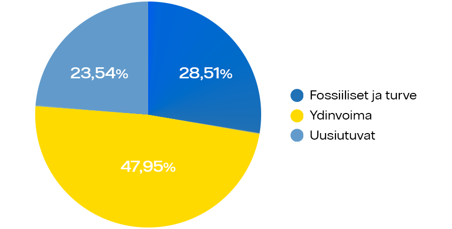 Vattenfallin Suomessa vuonna 2024 loppukäyttäjille (kaikki yritys- ja yksityisasiakkaat yhteensä) myymän sähkön tuottamiseen käytettiin yhteensä eri energialähteitä keskimäärin seuraavasti:
