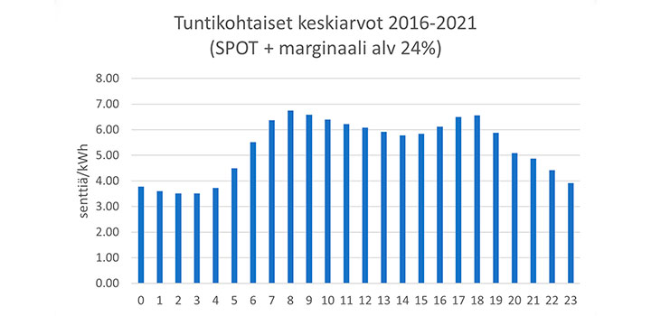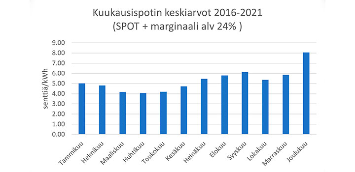 - Vuonna 2021 kuukauden spot-keskihinta: 5,87 snt / kWh. (Hinta on laskettu käyttäen tammi-kesäkuun hintatietoja.)