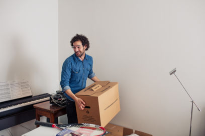 Pariskunta kantamassa muuttolaatikoita