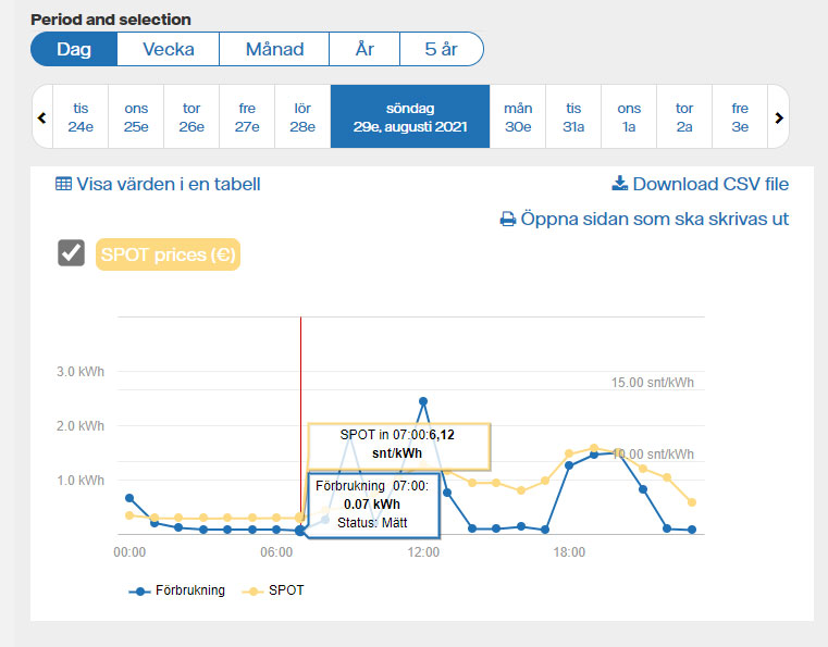 Eftersom många nätbolag ger oss din förbrukning på timnivå med en dags fördröjning kan du se din förbrukning per timme för en dag, vecka eller månad i den anläggningsspecifika tjänsten Min förbrukning.