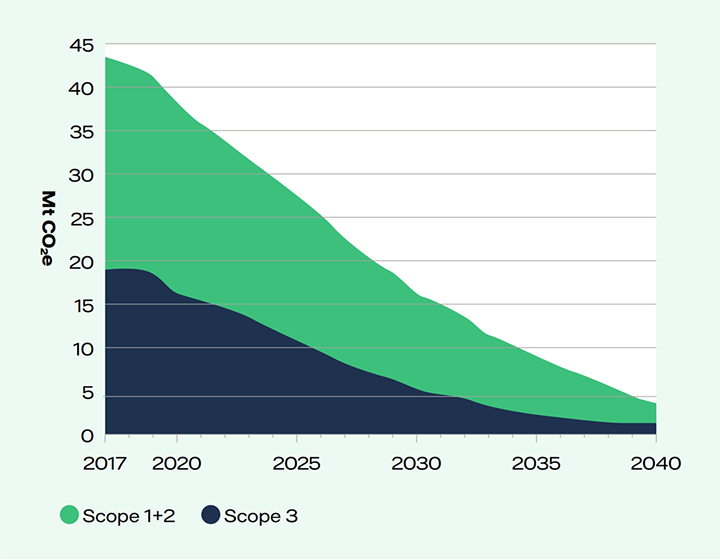 Sitoudumme vähentämään Scope 1- ja 2-luokkien kasvihuonekaasupäästöjä 77 %/kWh vuoteen 2030 mennessä ja 93,5 %/kWh vuoteen 2040 mennessä perusvuoteen 2017 verrattuna.