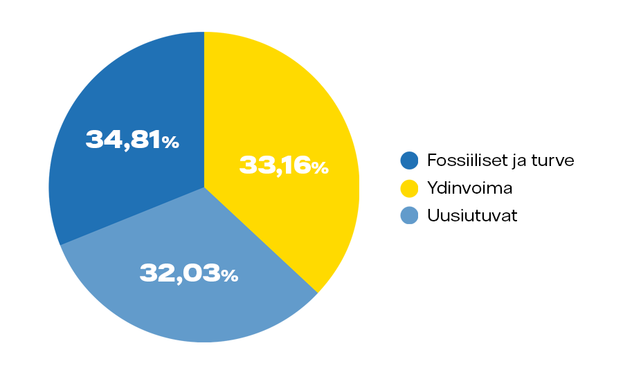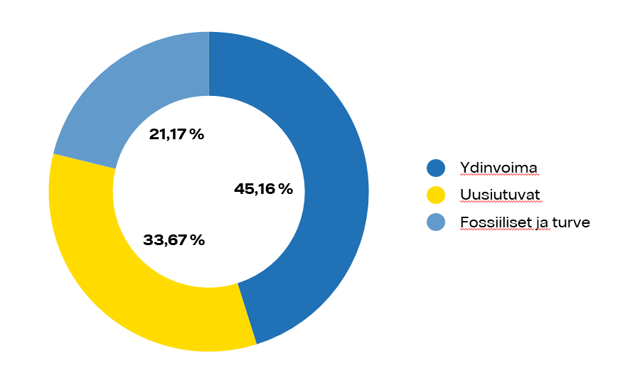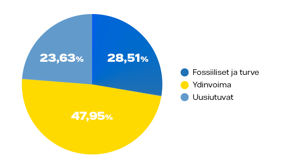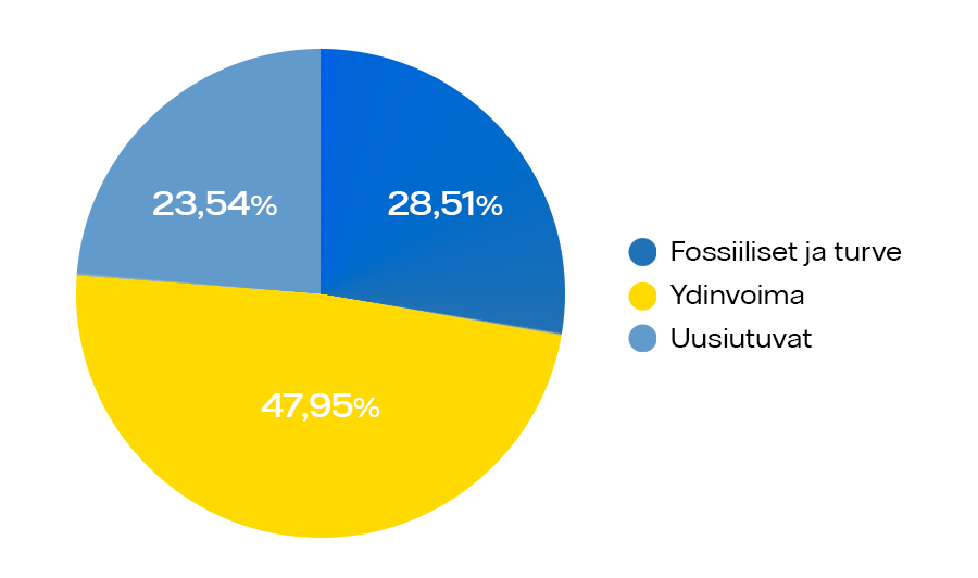 Piirakkagraafi jossa 23,54% uusiutuvia energianlähteitä, 28,51%  fossiilisia polttoaineita ja 47,59% ydinvoimaa.